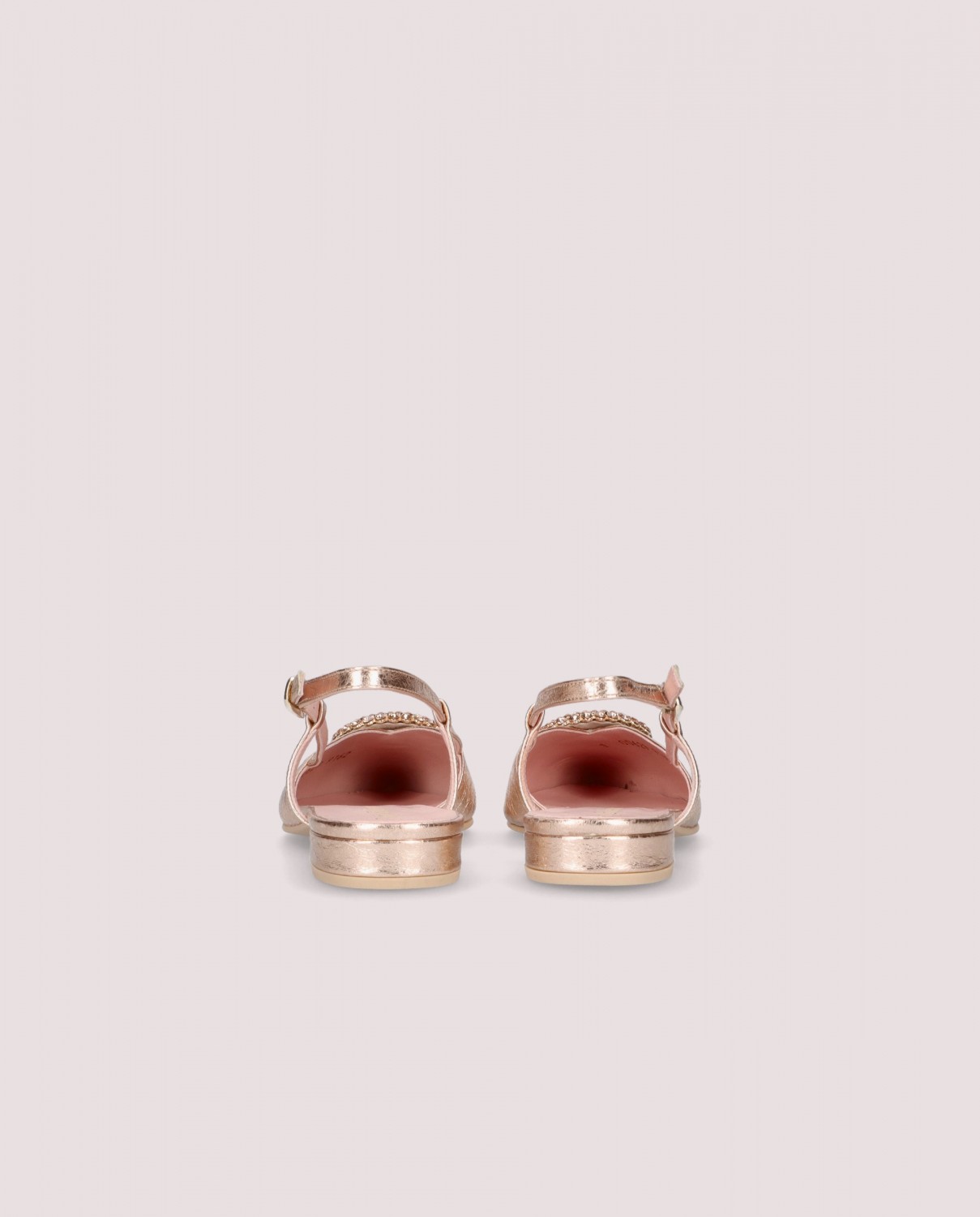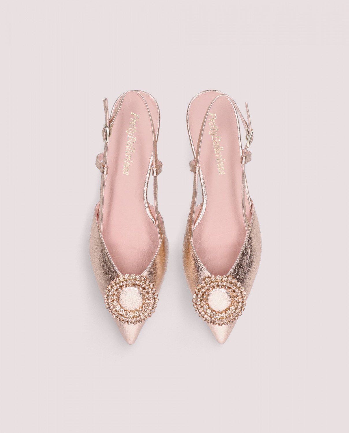 Slingback ballerina Clementine with a pointed toe and 1.5cm heel in rose gold metallic leather with crystal brooch detail, rubber sole, leather insole and lining.