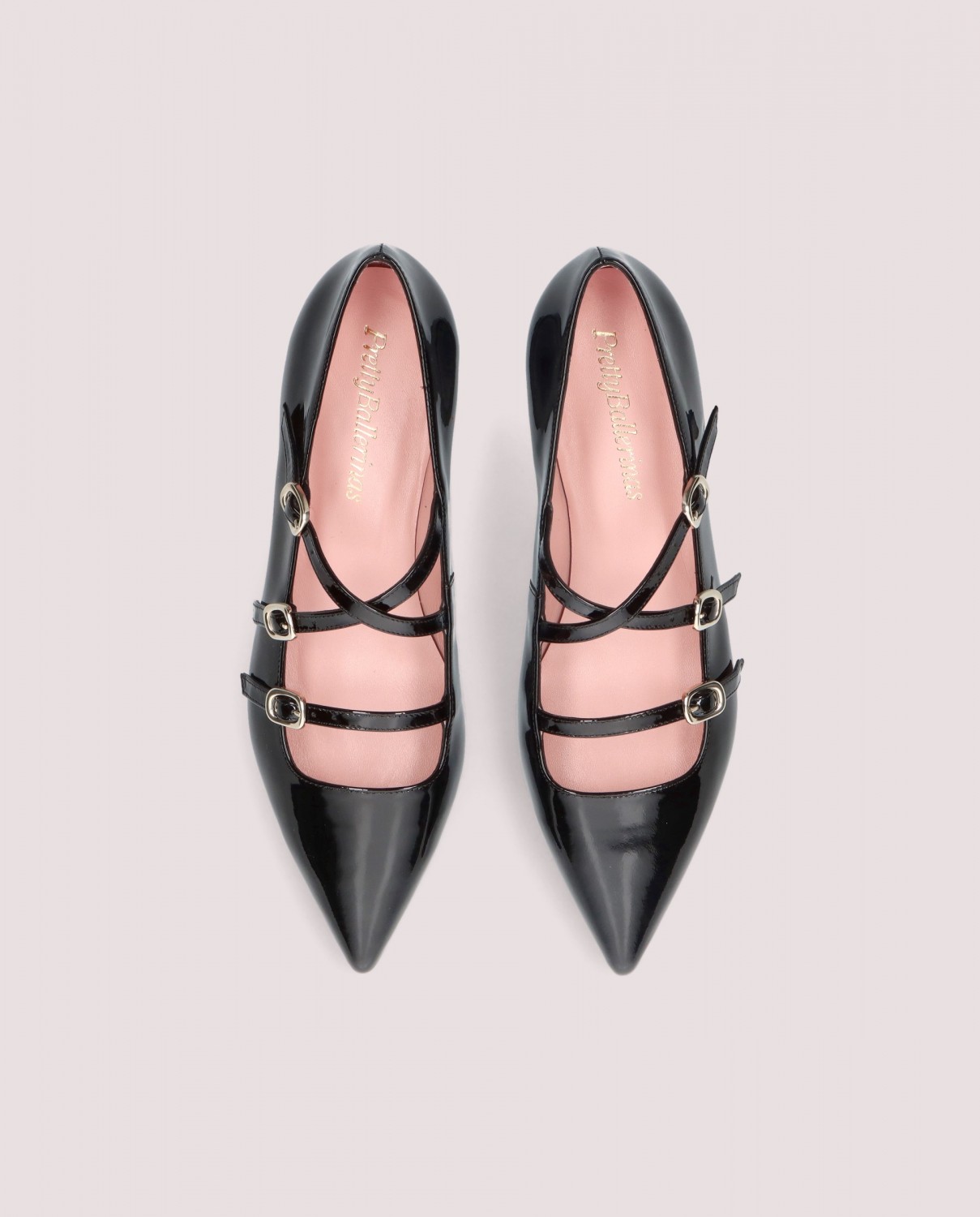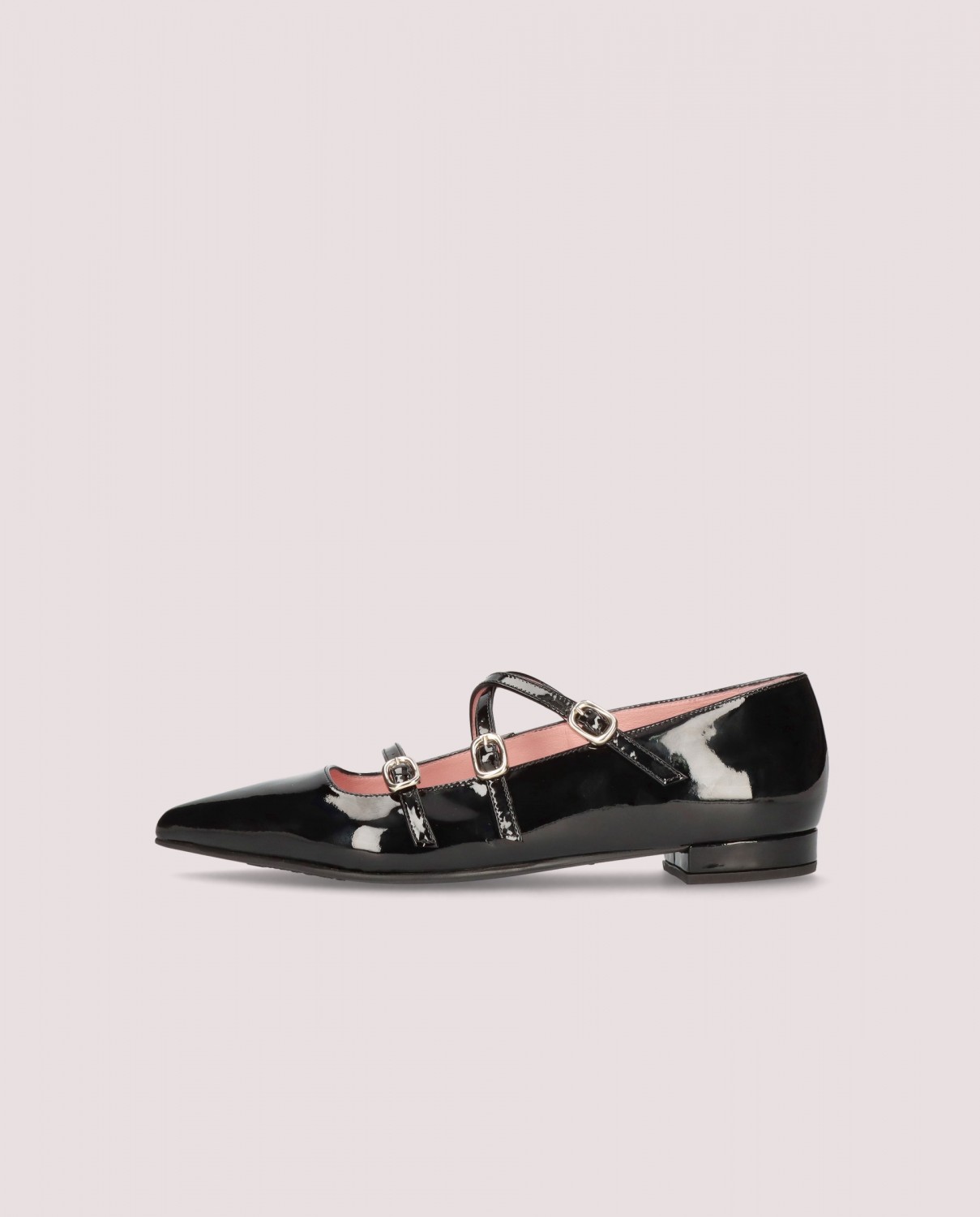 Ballerina Clementine with a pointed toe and 1.5cm heel in black patent leather featuring 3 straps with rubber sole, leather insole and lining.