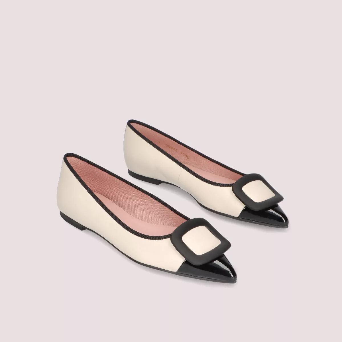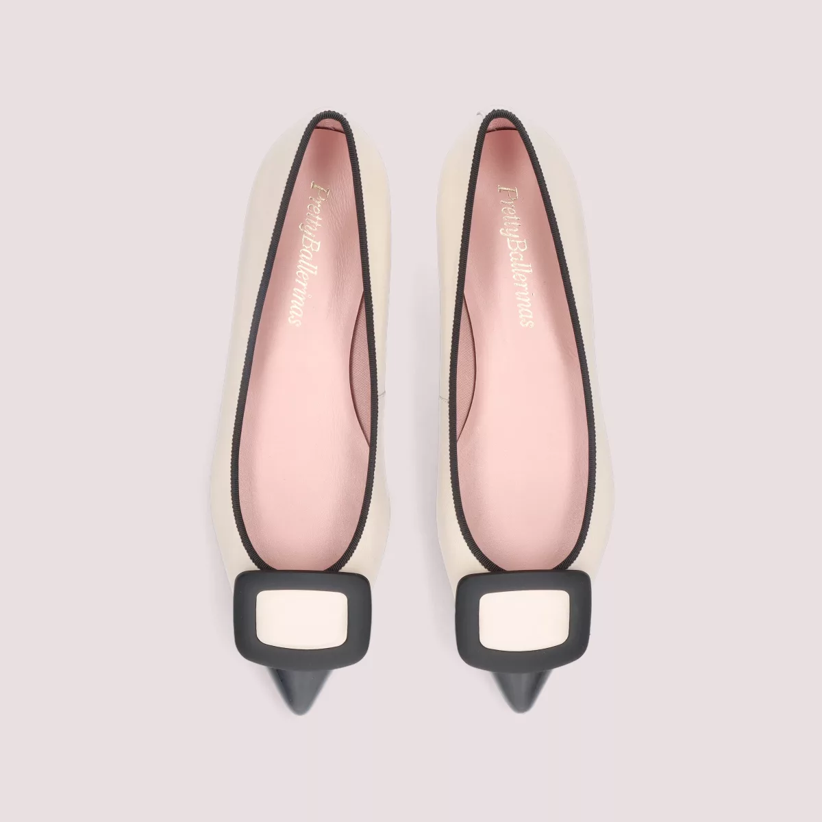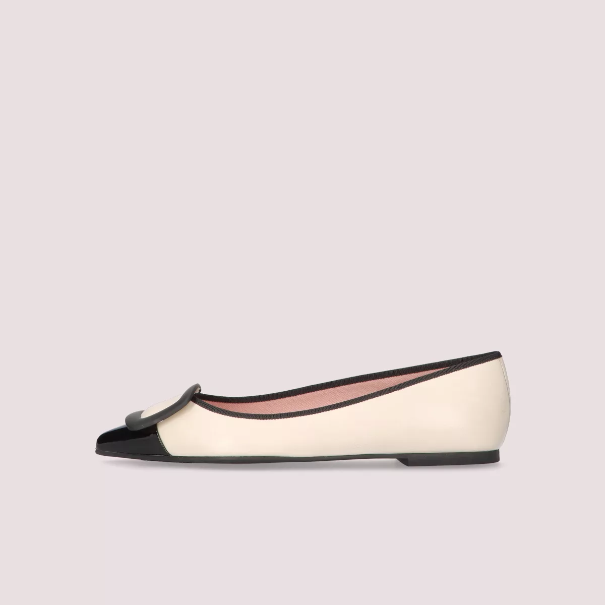 Bailarina de punta fina modelo Ella en napa suave color marfil con hebilla, puntera de charol negro y falla elástica negra, suela de goma, plantilla y forro de piel.