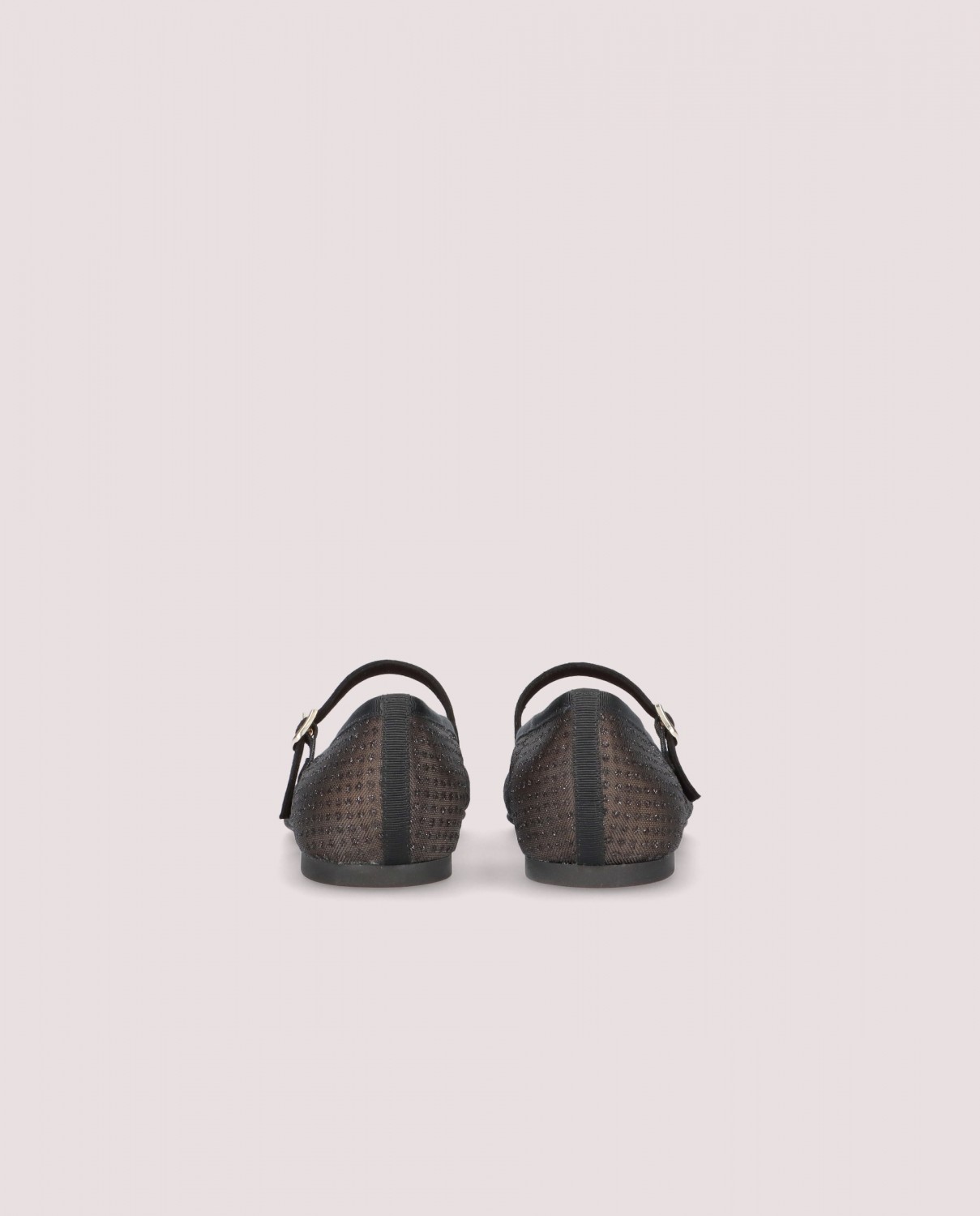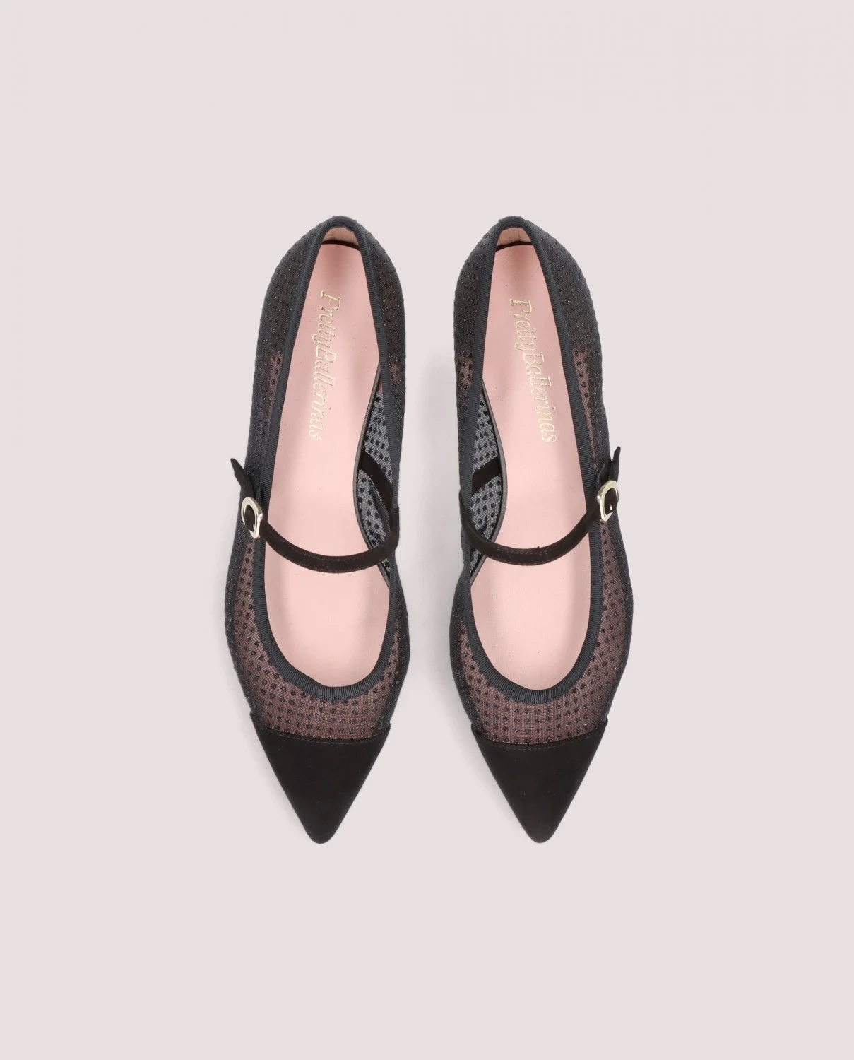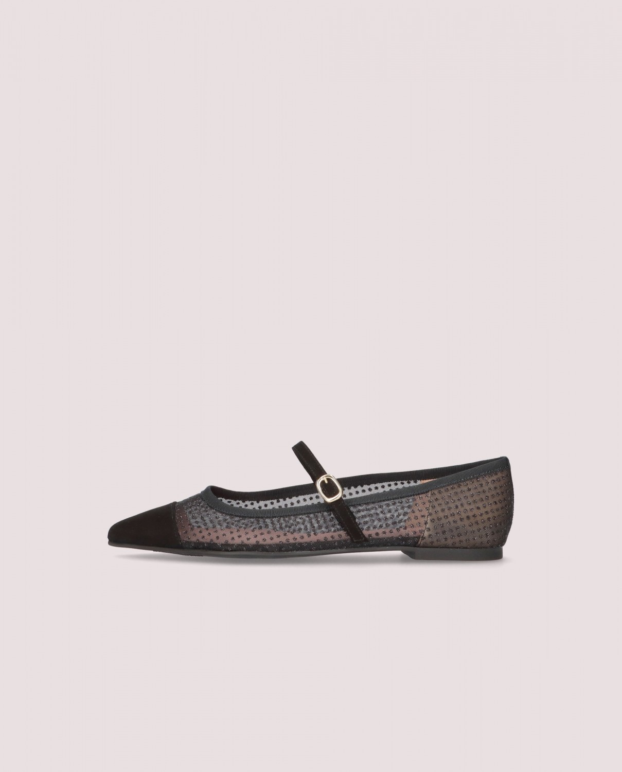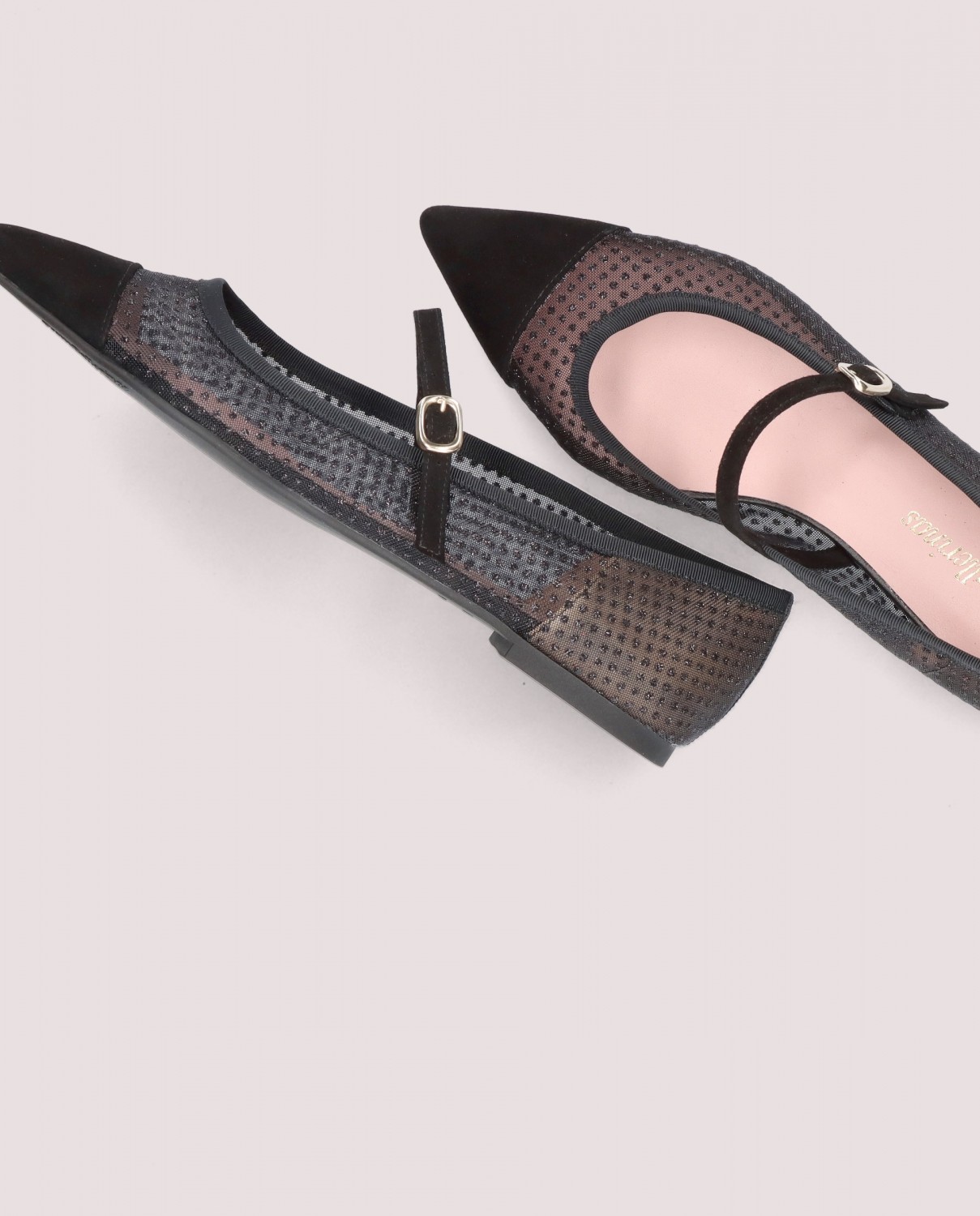 Mary Jane style ballerina Ella with a pointed toe in black polka dot printed mesh with black suede toe, rubber sole, leather insole and lining.