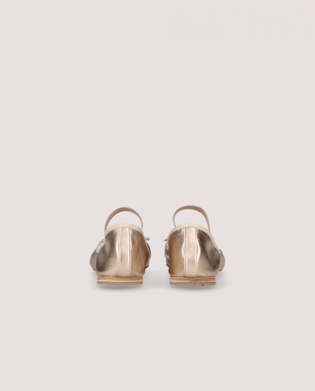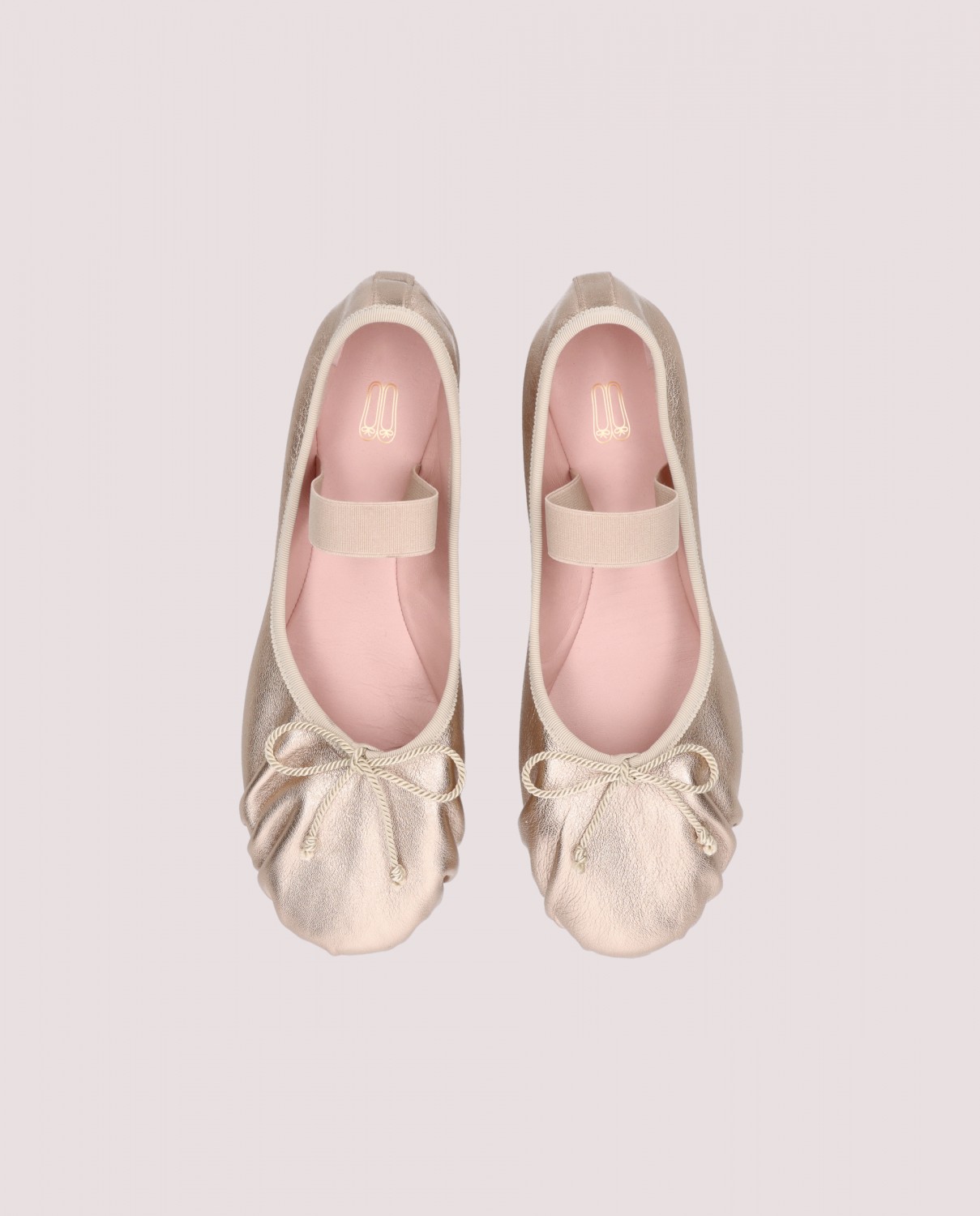 Sacchetto style ballerina Lea with elastic to keep on foot in nude metallic leather with leather sole, insole and lining. Unlike traditional shoe construction, Sacchetto involves stitching the inner lining directly to the sole, eliminating the need for insoles and providing a glove-like fit. This technique ensures maximum flexibility and comfort, allowing the shoe to adapt to the foot’s natural movements. The result is a sophisticated and luxurious footwear experience that seamlessly blends style and comfort in every step.