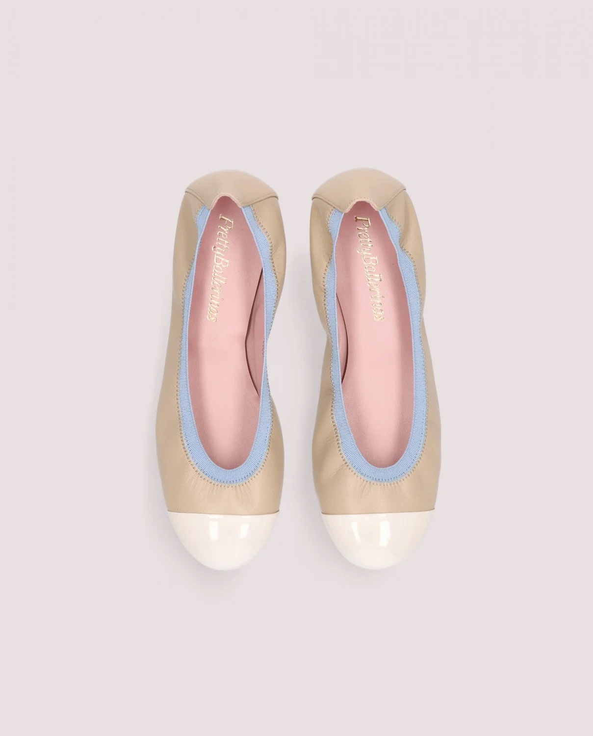 Flexible ballerina Shirley in soft nude leather with an ivory patent leather toe and light blue elasticated trim, rubber sole, leather insole and lining.
