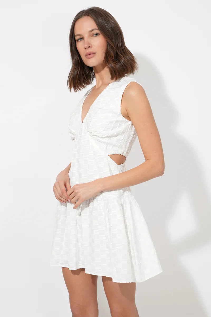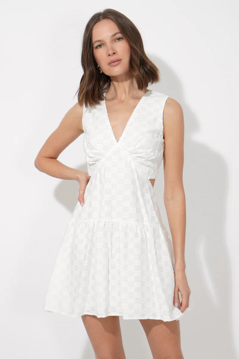 Cue the compliments—the Junia Mini Dress is here to steal the spotlight. Designed with a textured grid jacquard and subtle cutouts at the waist, this flirty mini balances playful details with modern polish. The deep V-neckline and softly gathered bust add a touch of romance, while the flared skirt gives you that twirl-worthy moment.