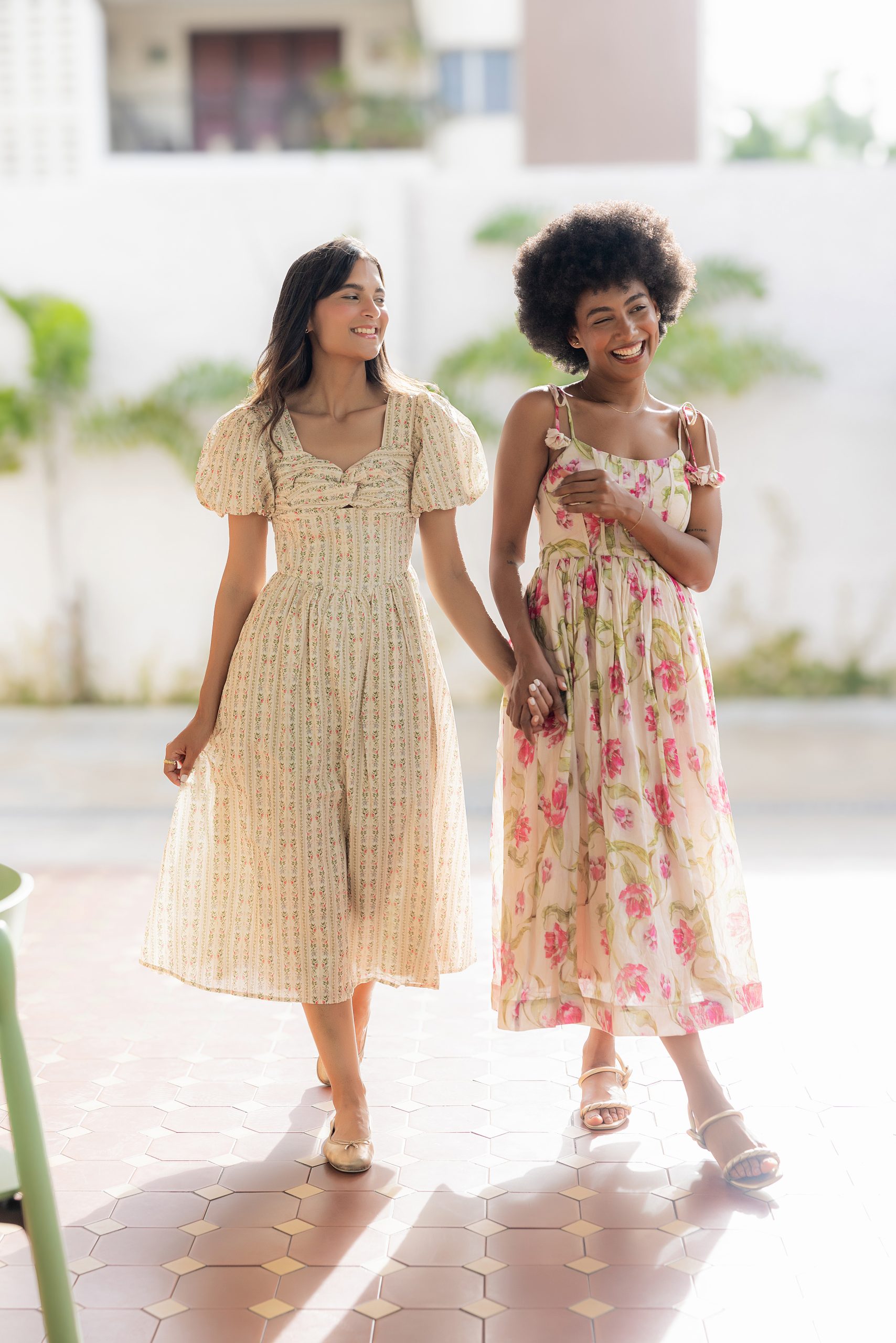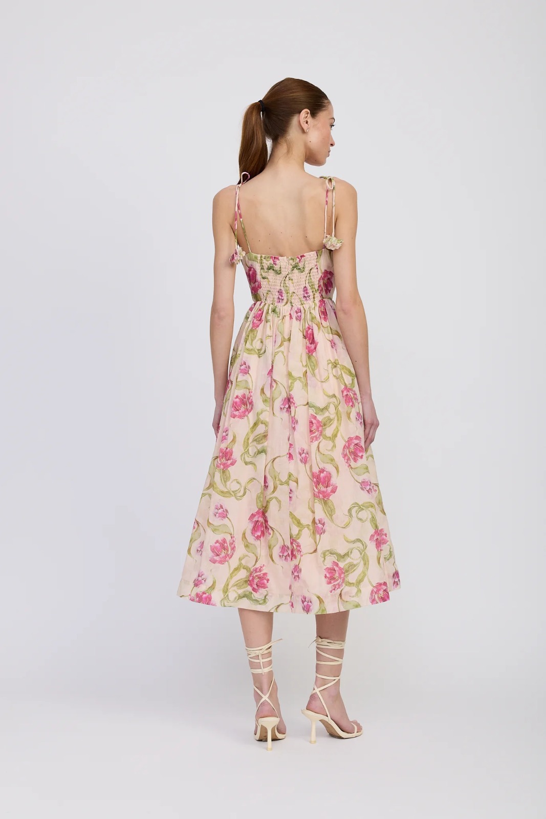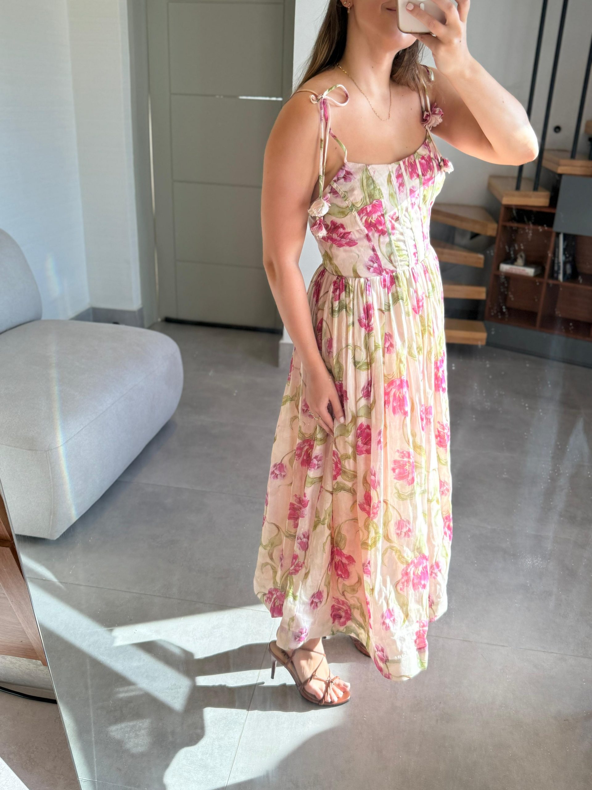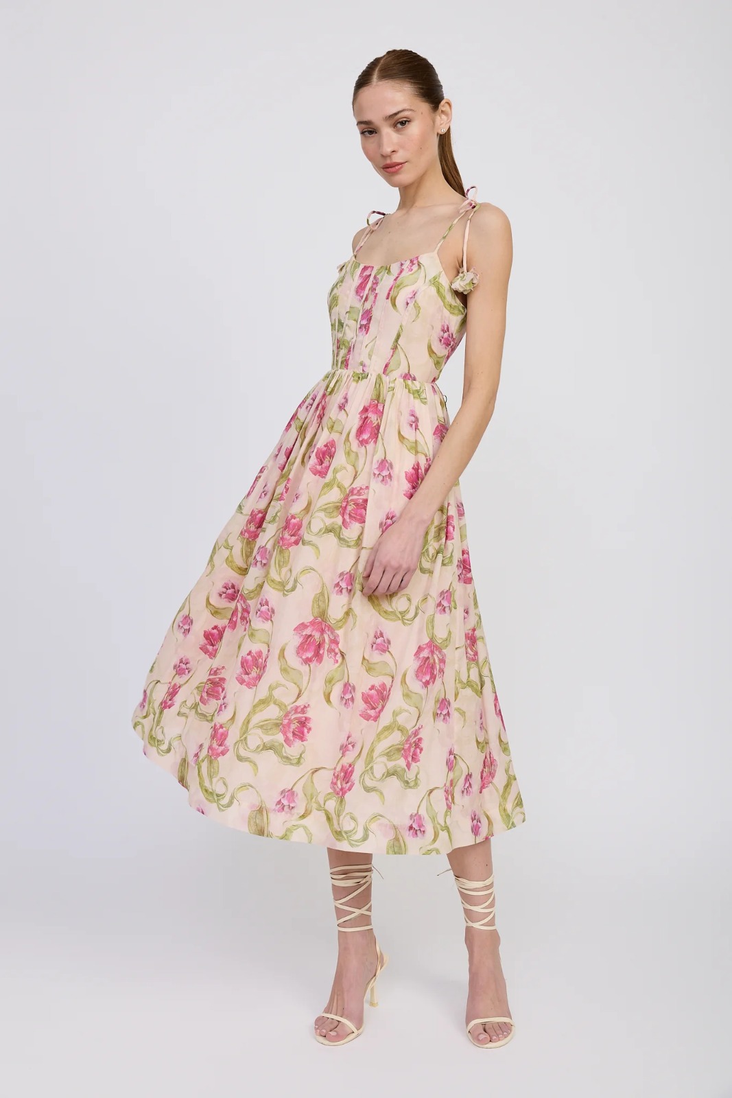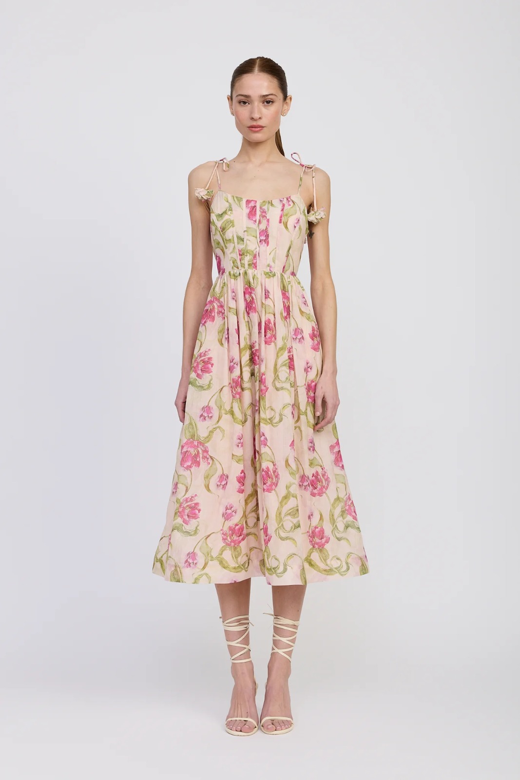 • Floral Tie Shoulder Corset Midi Dress