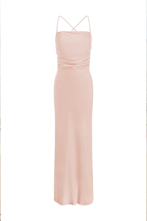 Our Lucienne Maxi Dress features a delicate back tie and ruching to add texture and detail to the piece for a flirty look.