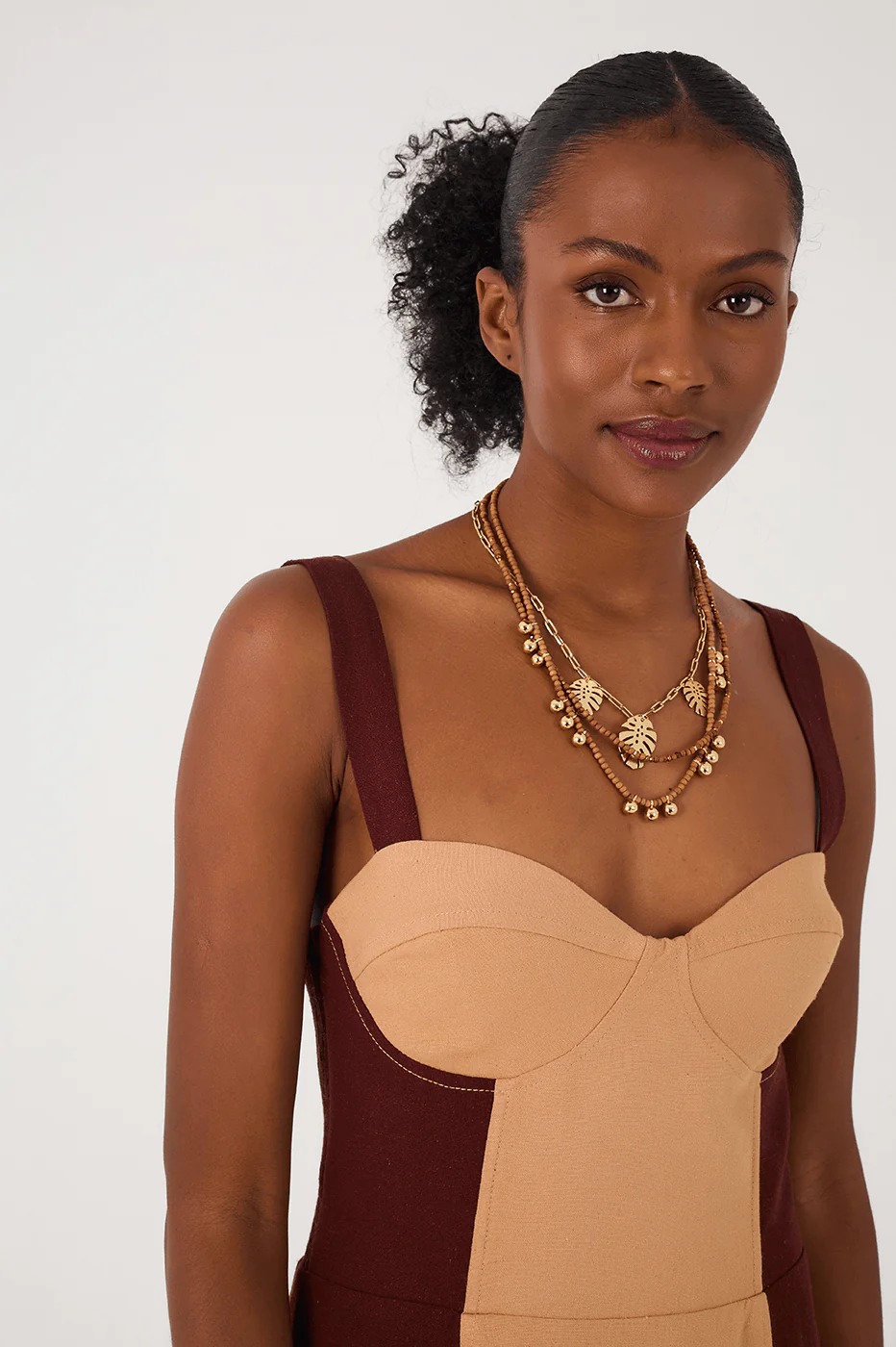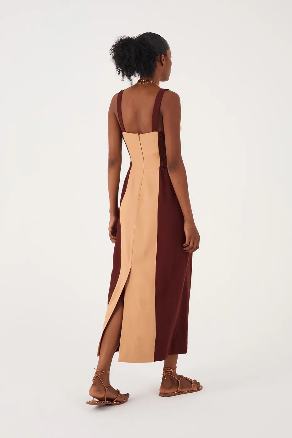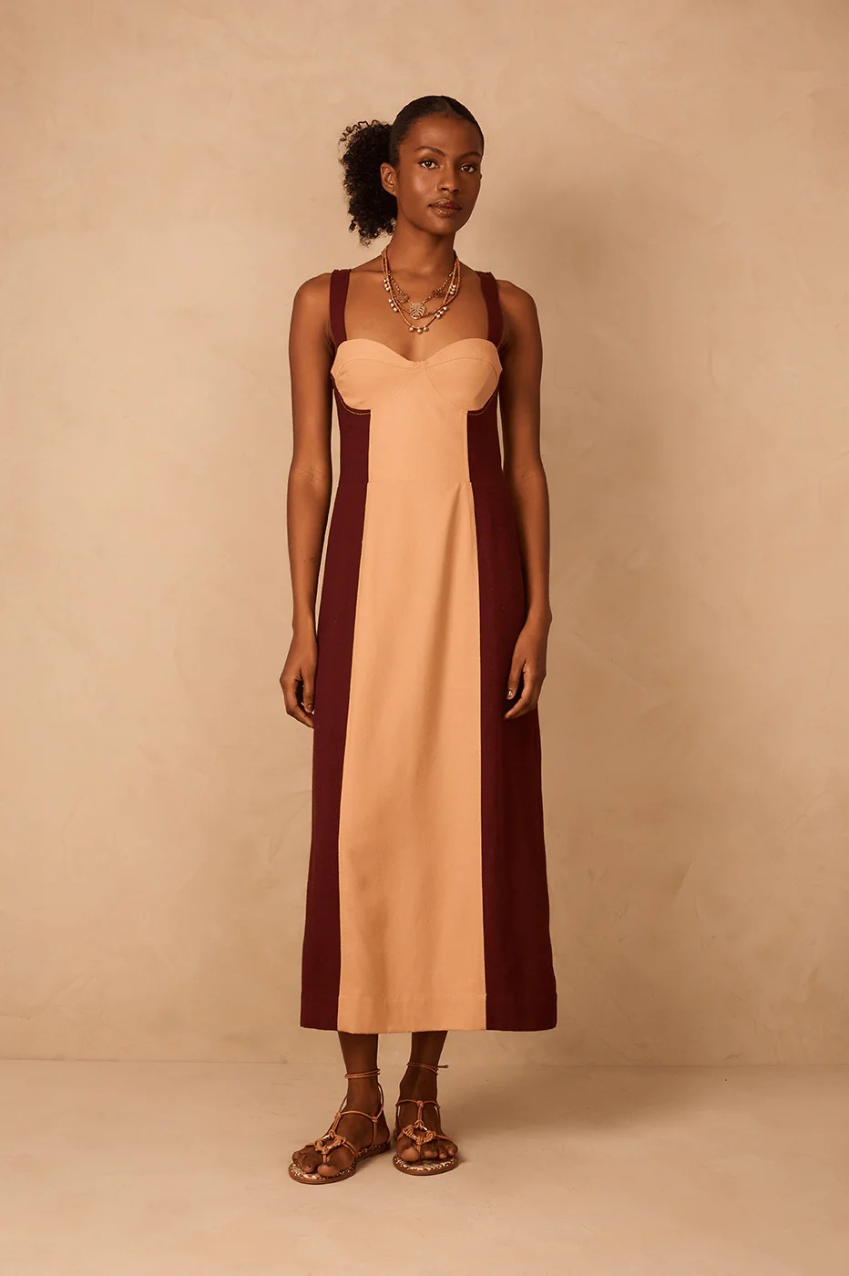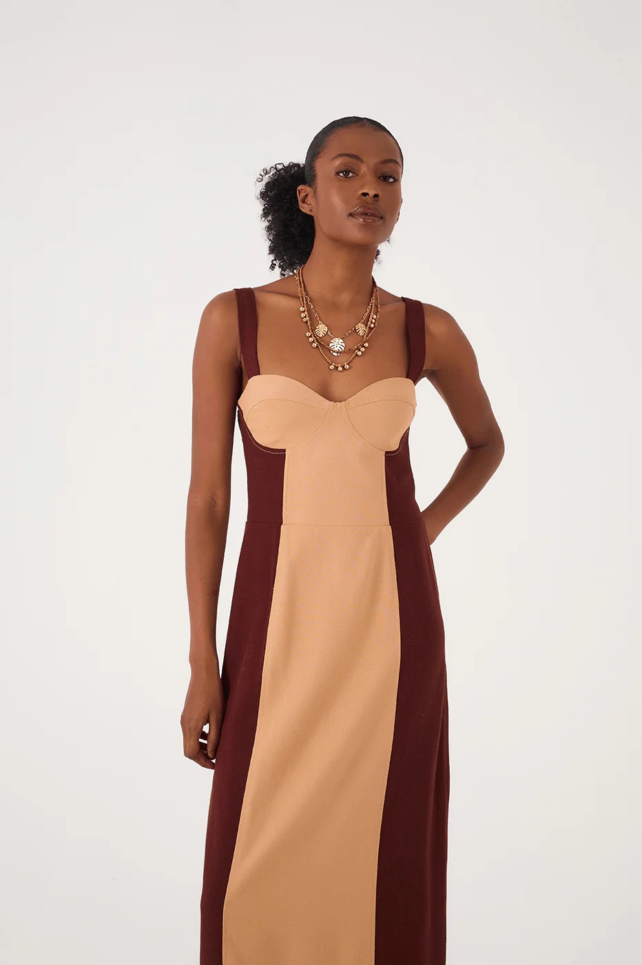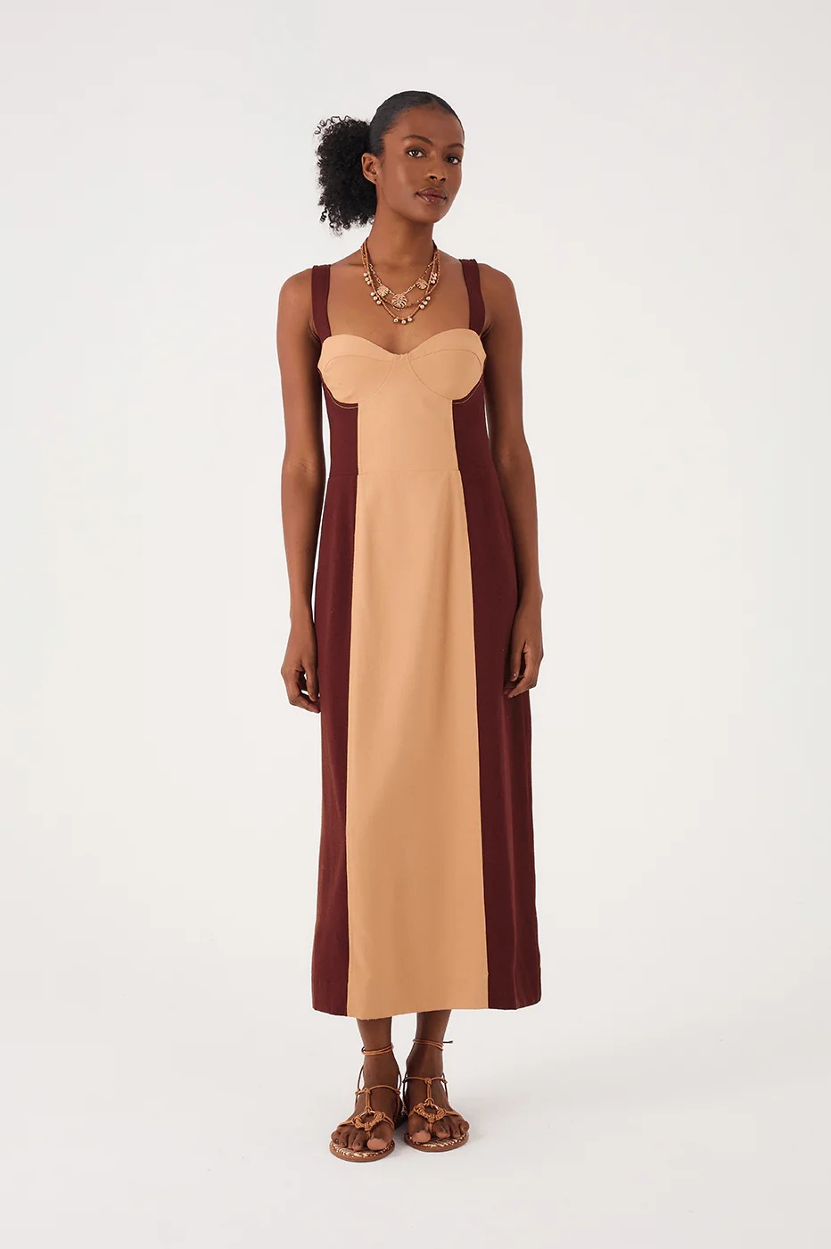That elegant and sophisticated shape we love. The Brown And Beige Linen Midi Dress is a two-tone style made of linen with wide straps, a plunging neckline, a cut-out bodice, and a midi length to add that carioca extra flair to your look.
