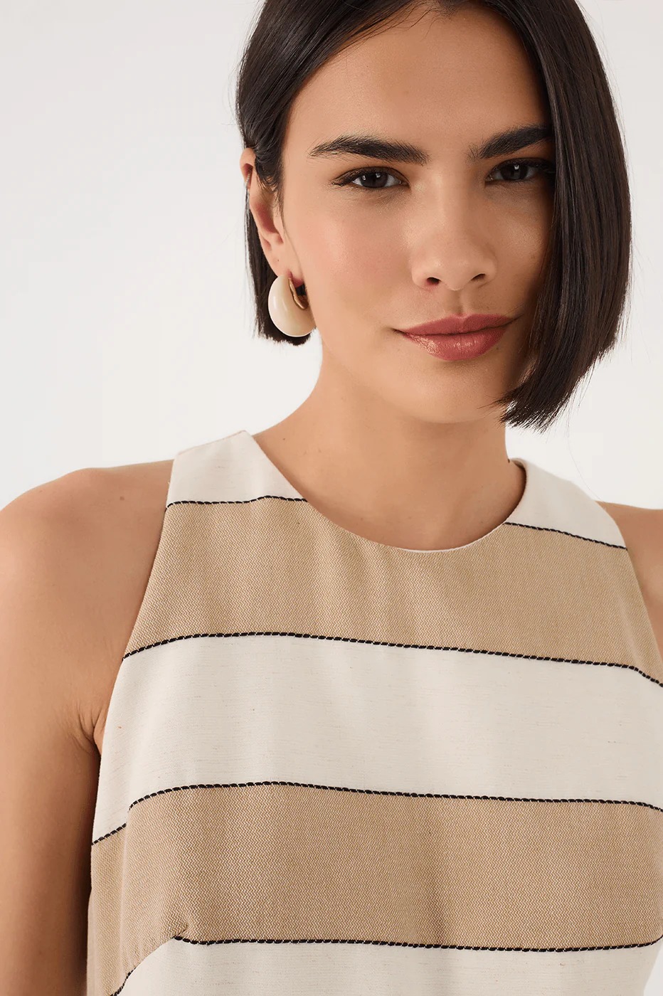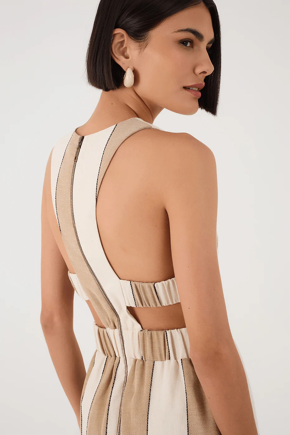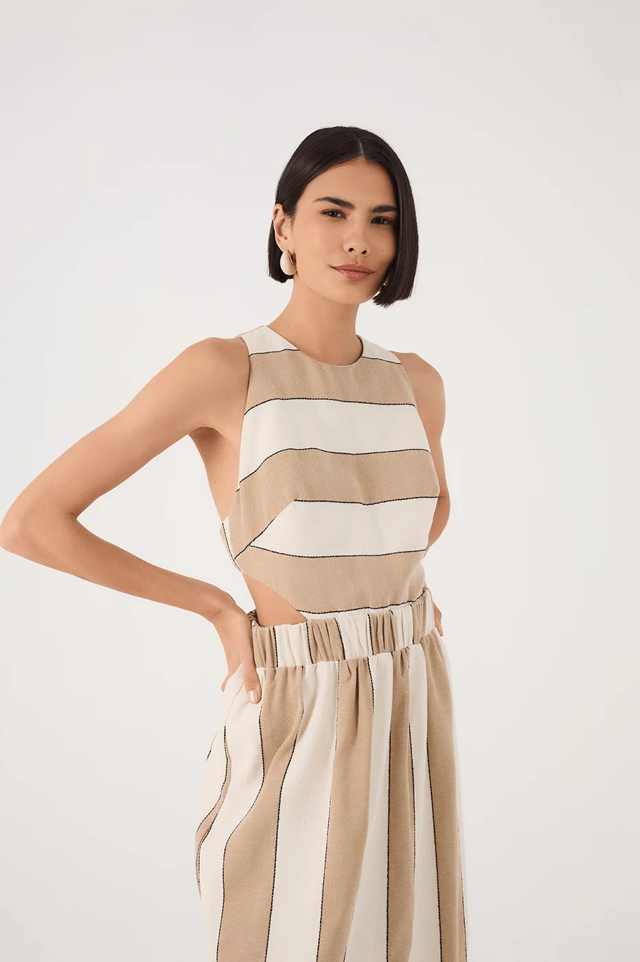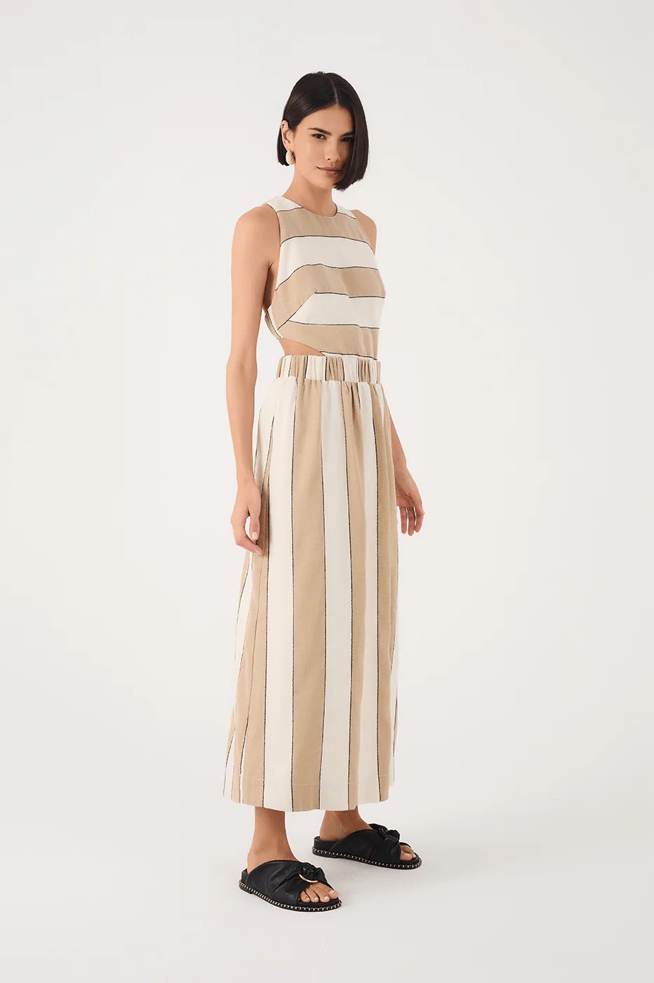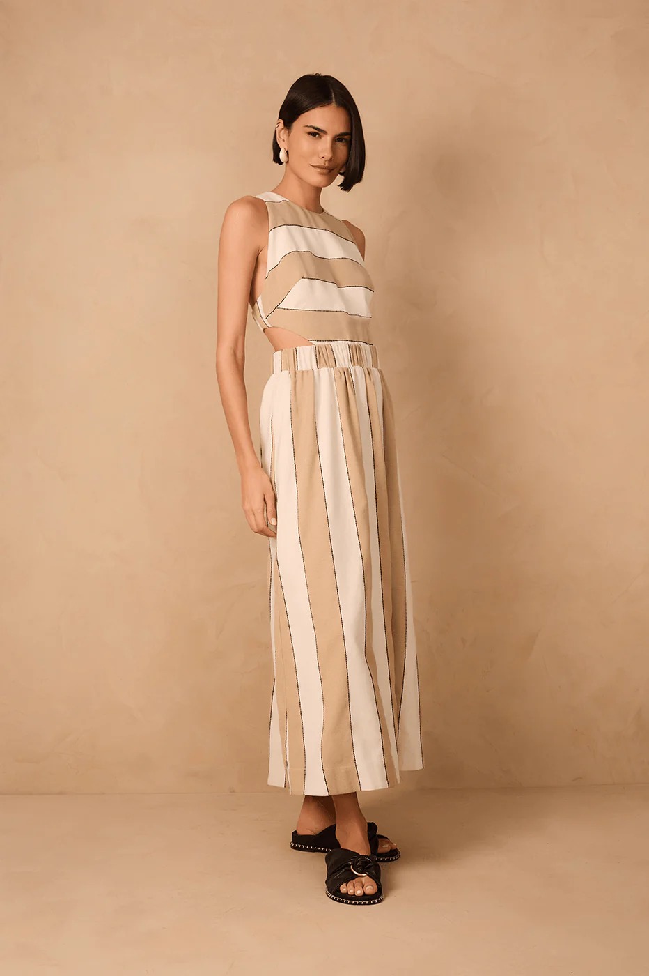 Made from fresh fabric, the Beige Stripes Cut-Out Bodice Linen Maxi Dress boasts an elegant and sophisticated look, featuring no sleeves, openwork cut-outs, and an elastic waist that enhances the silhouette with a perfect fit.
