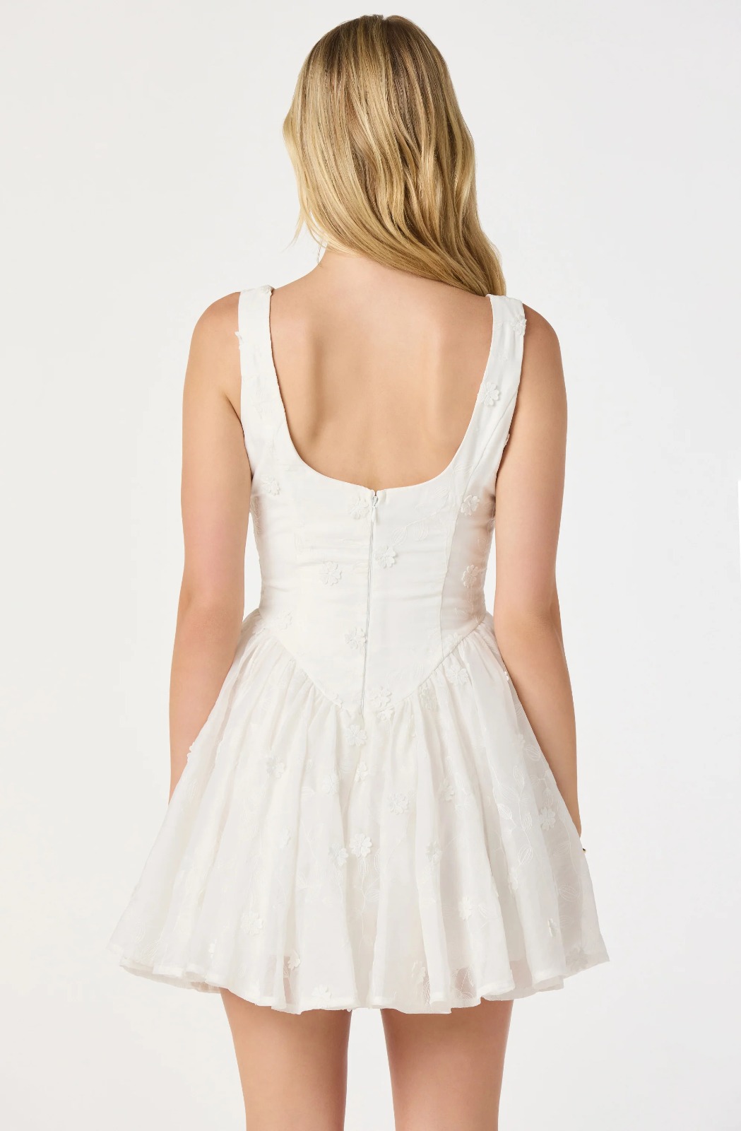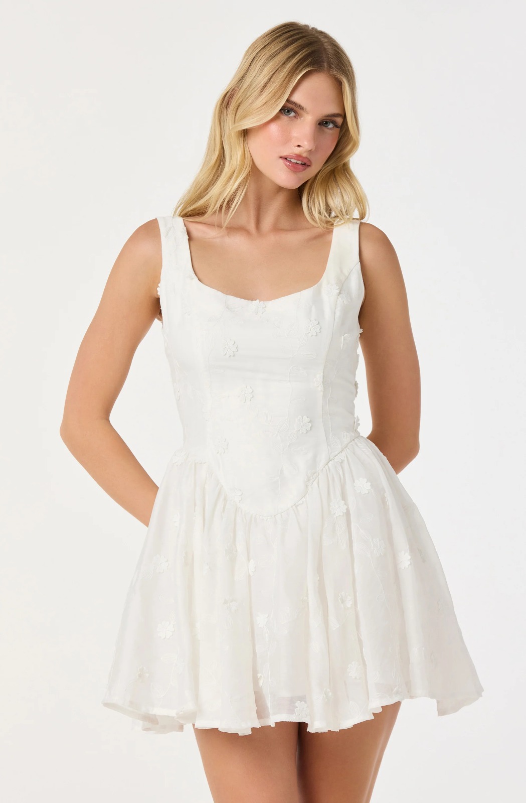 Intricate floral embroidery and dimensional flower appliqués create enchanting texture in this chiffon mini dress. The princess seams sculpt the bodice, while the gathered skirt with tulle lining offers beautiful movement and volume.