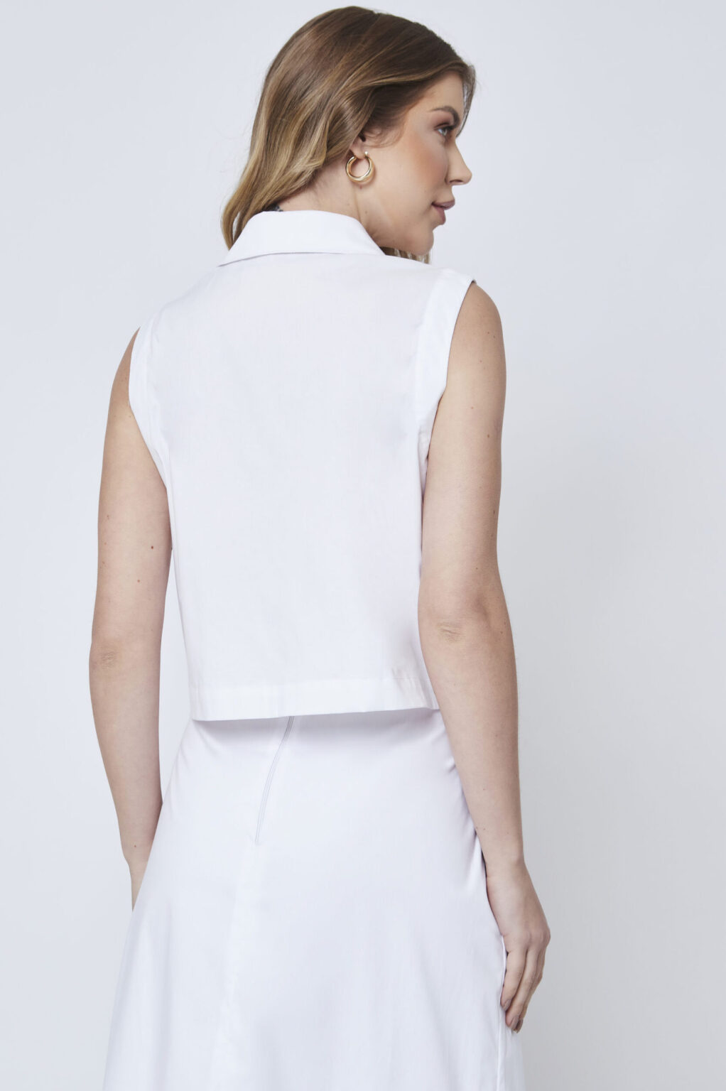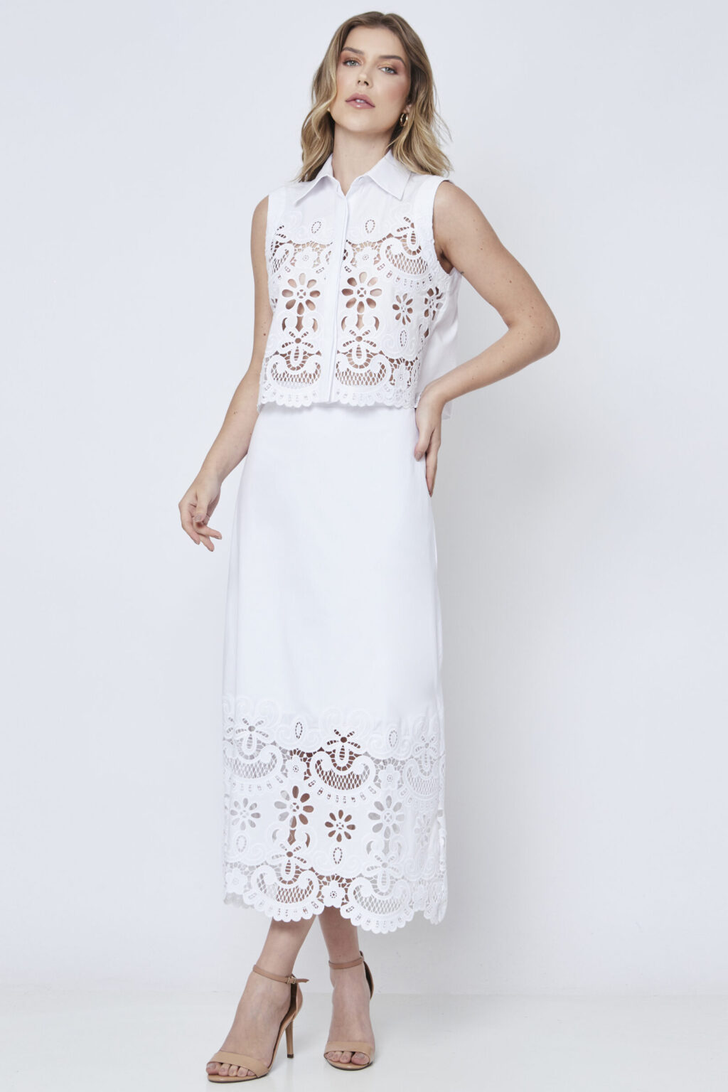 Camisa cropped de algodón, bordado Cézanne con cierre de botones en la parte delantera. Falda midi recta confeccionada en galés, bordado Cézanne en el bajo y con cierre de cremallera en la espalda.